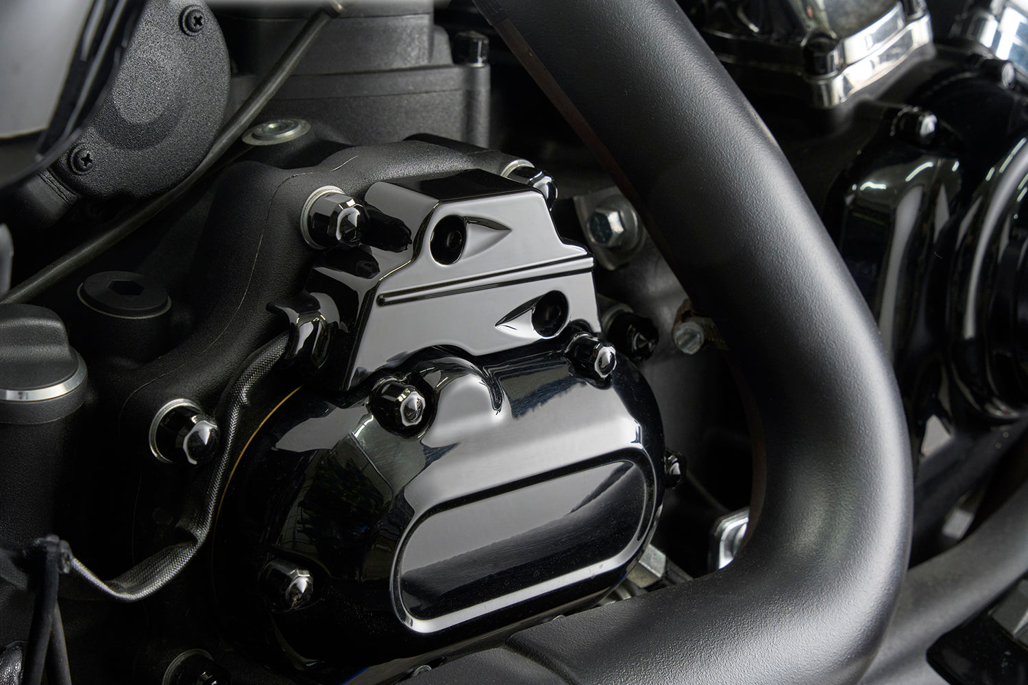 Replace your textured plastic OE gear position sensor cover with a heavy-duty chrome or gloss black part that bolts right on to your bike. This part dresses up your transmission and also won't stain if you drip oil on it.