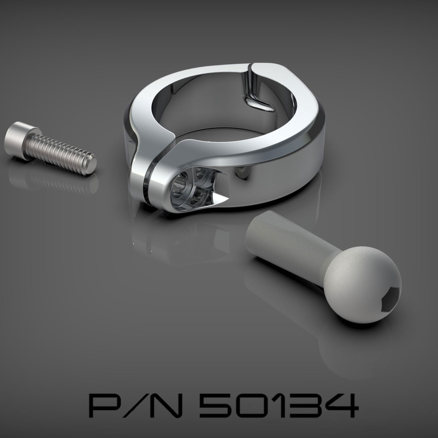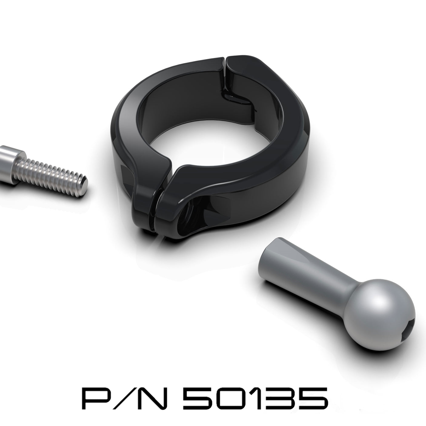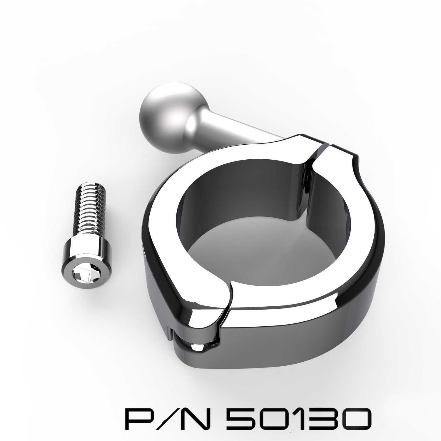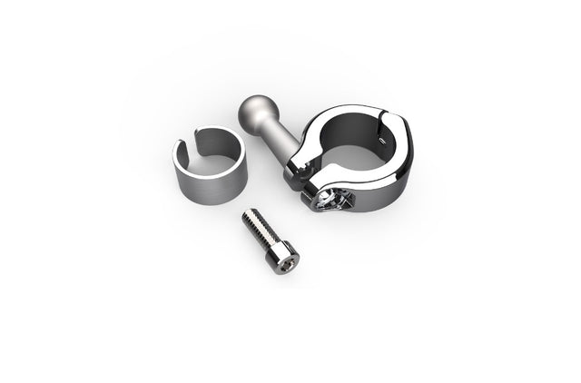 Clean, single bolt attachment clamp made of heat treated aluminum. Compatible with Ciro accessories, including phone holders, drink holders and camera mounts. Available in chrome plated or black finish and in  1-1/8" or 1-1/4" kit and 1-1/2" kit (each kit sold separately) .