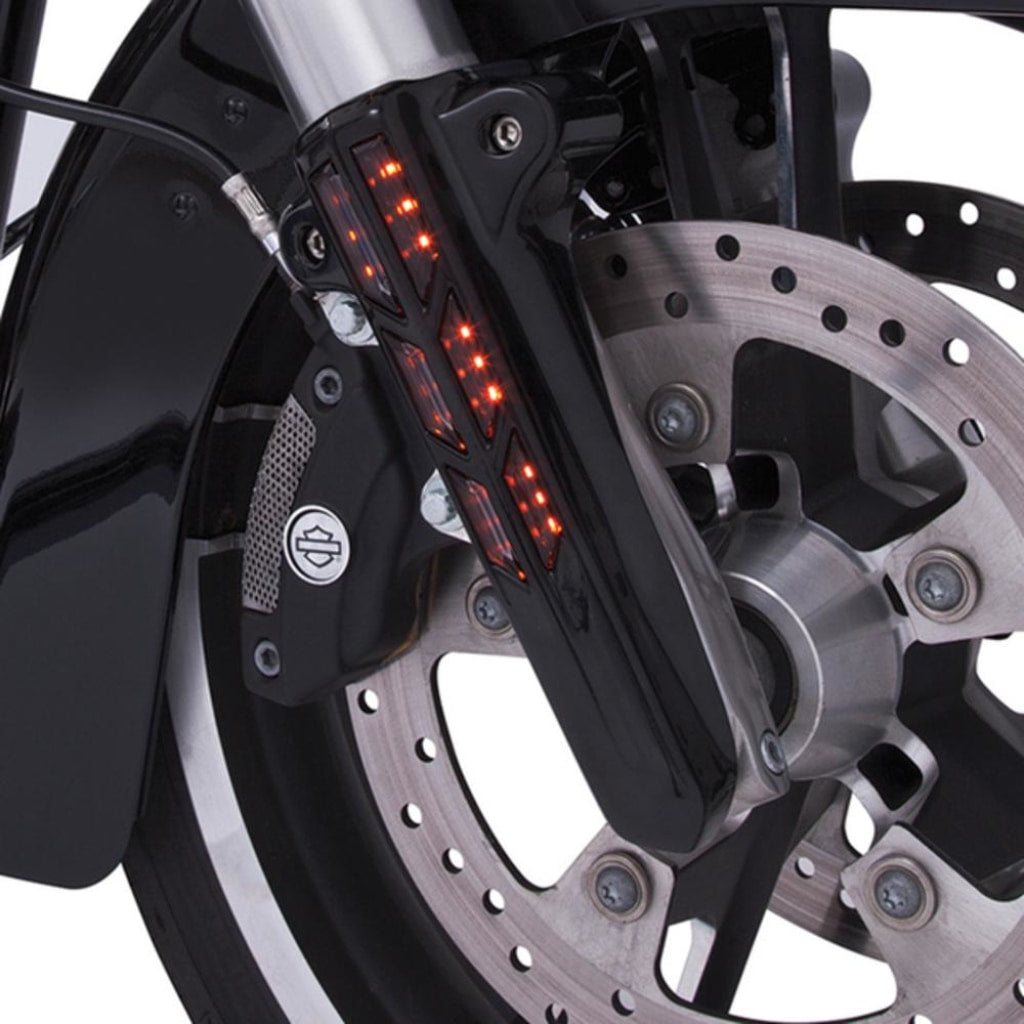 The most requested area to improve on a motorcycle has been the lower front forks and Ciro has the answer with their Forkini Lower Leg Covers. Ciro has answered with these stylish leg covers available in lighted chrome or black finish versions. Easy to bolt-on and enhances the look of the motorcycle front end. Plug and play wiring adds run and turn lighting. Bright amber LED lights look great and increase visibility with additional side lighting. Cover the factory axle nuts with smooth, clean look. Designed to hide the unpolished rough cast areas the factory forgot.