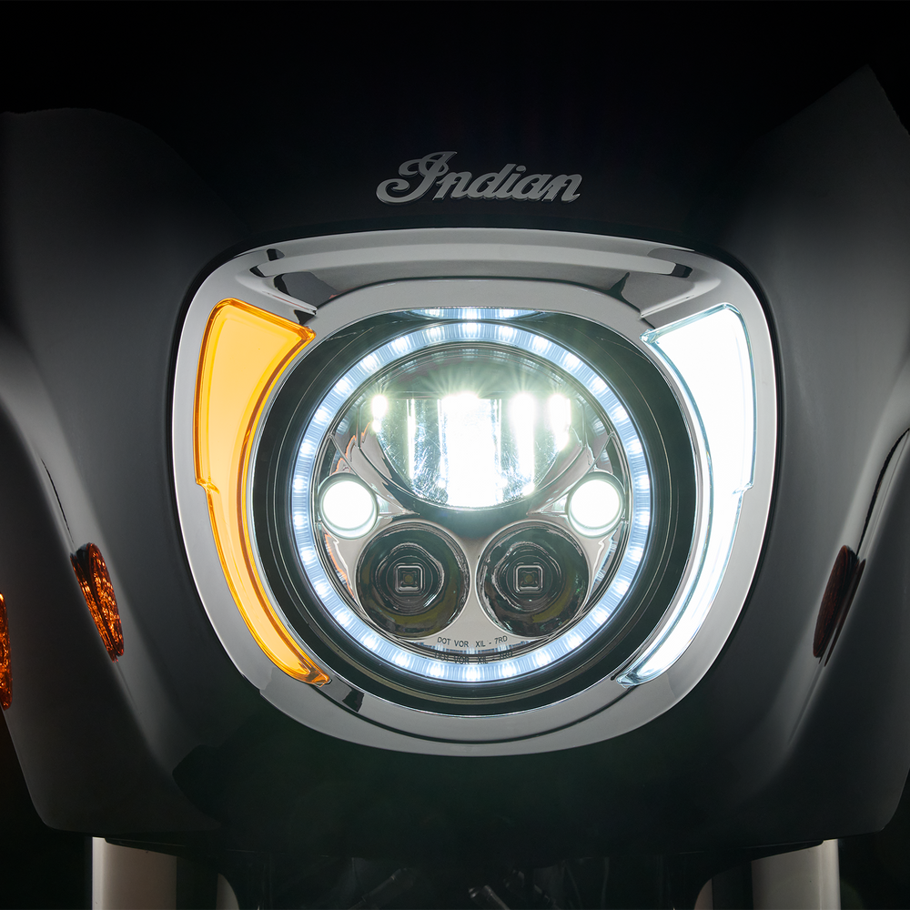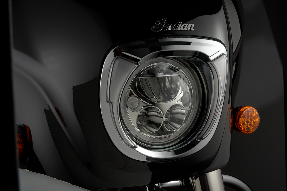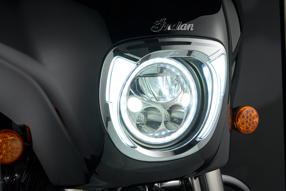 Enhance the look of your Chieftain with the Ciro Fang Headlight Bezel. Available in chrome or black finish, the LEDs glow brightly through the polycarbonate lens with Ghost Lens Technology, which disperses the light for maximum impact. Amber turn signals add to the look and provide high visibility while on the road. The plug-n-play harness provides an easy, no-fuss installation with quick disconnects to make servicing the fairing a snap. Backed by a strong limited lifetime warranty, you can buy with the confidence Ciro has provided our customers for over a decade.