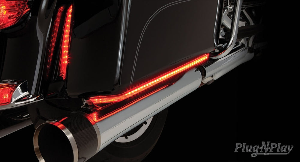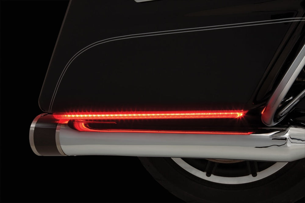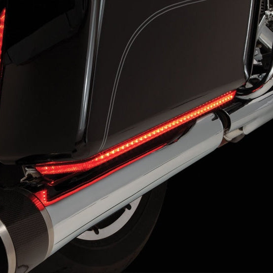 The Ciro Machete LED Lights are function and style in one stealthy package. These lights feature a smoked, shatterproof, poly-carbonate lens with built-in optics to create an eye-catching bar of light below your saddlebags. These lights are designed with aggressive riding in mind and the low profile housing maintains plenty of ground clearance while cornering.