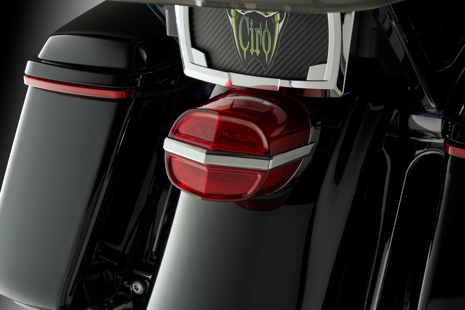 Designed to directly replace the stock rear tail light on most '99-later Harley-Davidson models, the Ciro® Armor Tail Light with Lightstrike® features multiple LED lights that illuminate with a variety of programmable brake and start up animations powered by our free Lightstrike® app. Available in a high strength polycarbonate red or light smoke lens with included chrome or black accents, this DOT and ECE approved tail light will provide the maximum visibility and style while riding.
