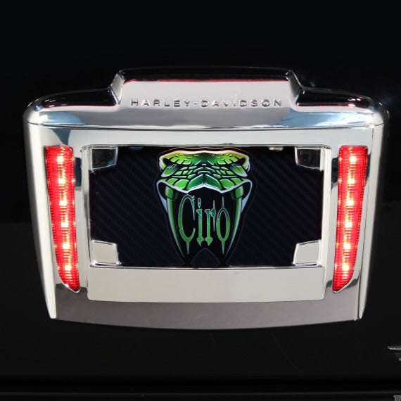 The Ciro® Lighted License Plate Frame for Tri Glide® is a dramatic way to customize the rear of a trike. This is a unique license plate mount with hidden fasteners and a sculpted shape. The plug-n-play LED lights add a run only function to help increase your visibility on the road. Its handsome looks and bright lights will transform the rear end of your trike.